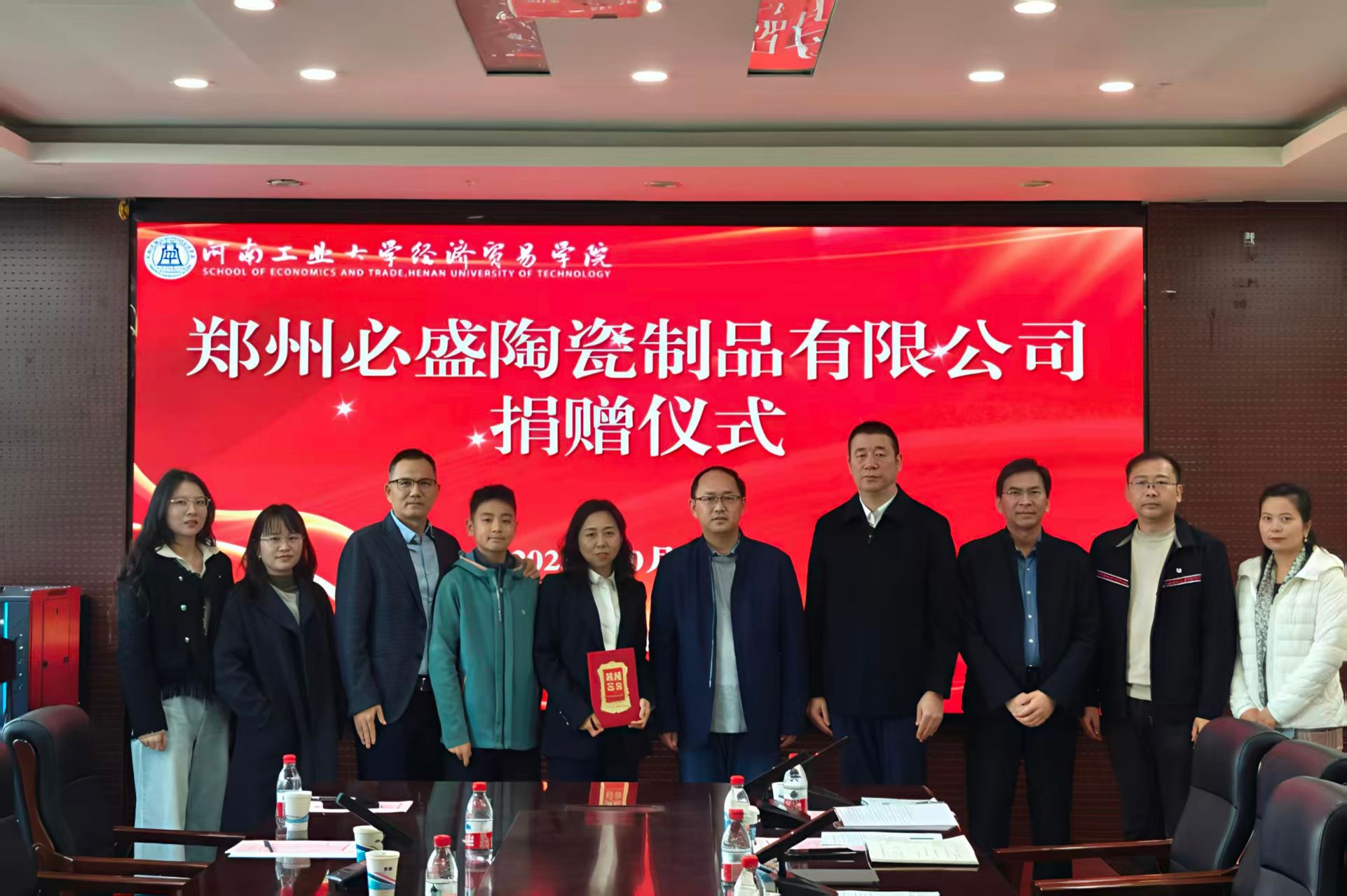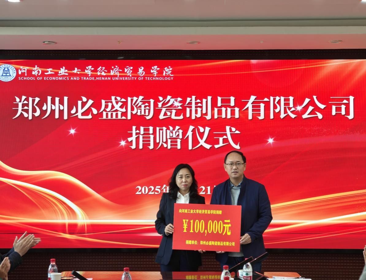 2025年10月21日上午,经济贸易学院与郑州必盛陶瓷制品有限公司于博识楼3501会议室举行捐赠仪式。郑州必盛陶瓷制品有限公司总经理刘春燕、业务经理张娇娇、设计总监李佳雯、学院领导班子、全体中层及师生代表等出席仪式。仪式由院党委副书记岳鹏珍主持。