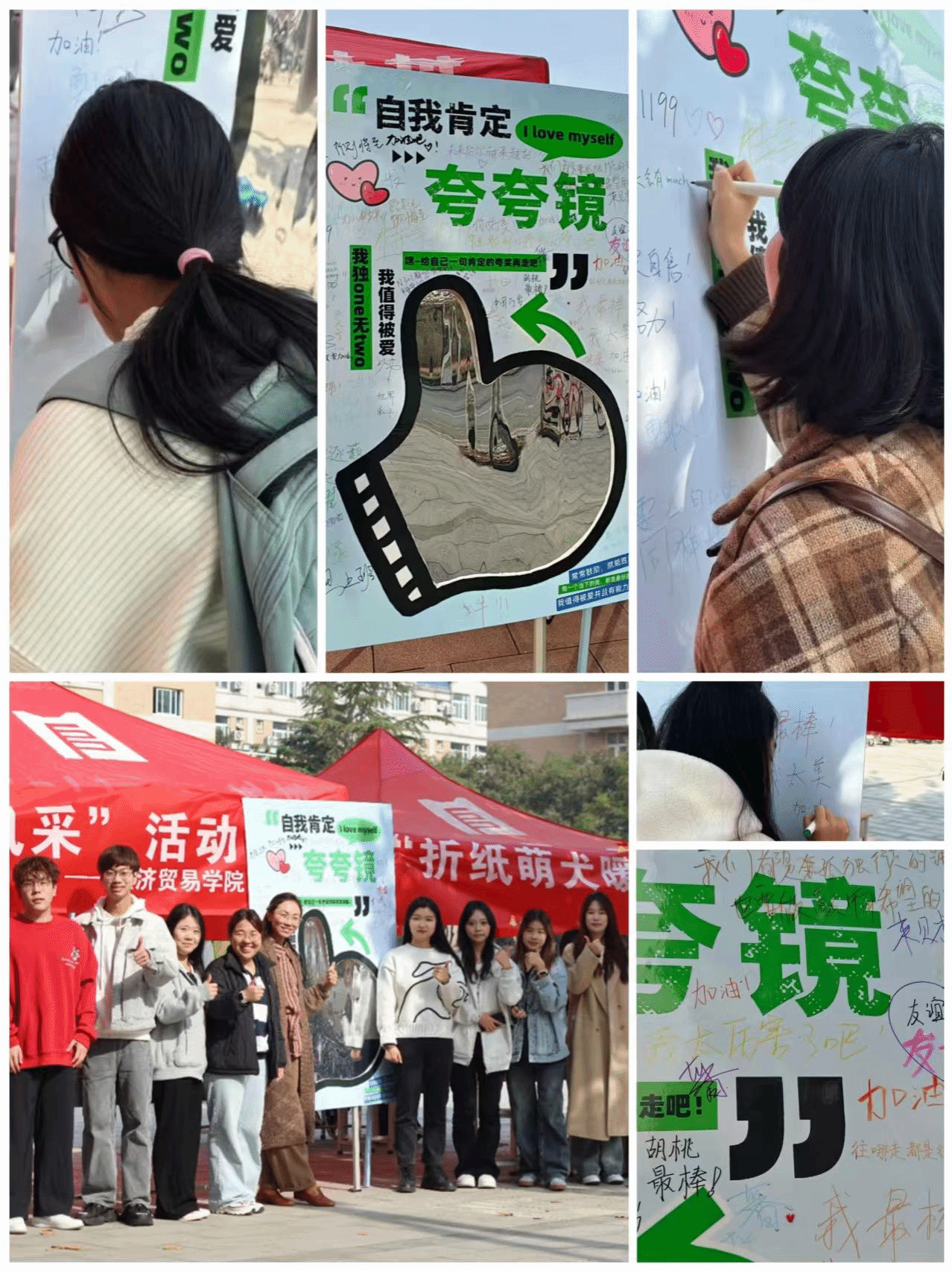 为营造健康包容的校园心理环境,打破标签化束缚,减少负面评价对学子心理健康的影响,引导同学们在积极正向的氛围中成长成才,11月12日,经济贸易学院举办了以“镜中闪耀,夸出风采”为主题的夸夸镜活动。活动吸引了众多同学参与,同学们在专门设计的展板上写下对自己的鼓励、对同学的赞美,分享身边的温暖小事,不少同学在阅读他人留言时露出笑容,现场氛围温暖而热烈。