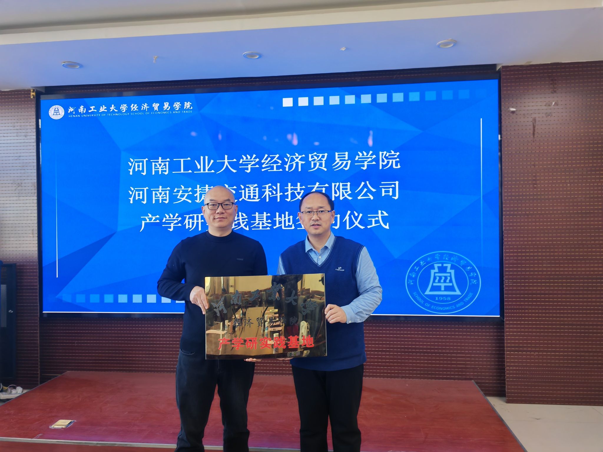 为进一步加强校企合作,促进产学研深度融合,经济贸易学院于12月3日在3号楼501会议室与河南安捷交通科技有限公司举行产学研实践基地签约仪式。经济贸易学院院长李文启、副院长郭力、经济系主任何宇鹏、教师代表任新平、王海虹,河南安捷交通科技有限公司总经理李峰、技术总监周育乐、行财部经理陈辉参加了会议,会议由李文启主持。