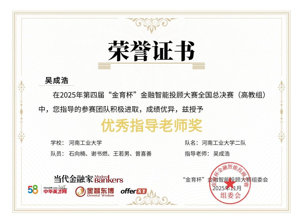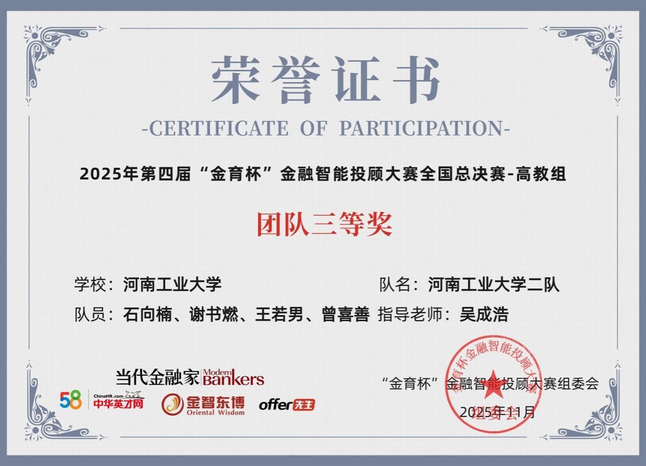 近日,第四届“金育杯”金融智能投顾大赛全国总决赛圆满收官。作为全国性金融人才竞技平台,本次大赛由《当代金融家》杂志社主办,金智东博(北京)教育科技股份有限公司、中华英才网、offer先生联合承办,全国130多所院校、近4000名学生入围全国总决赛。我院石向楠、谢书燃、王若男、曾喜善等四位同学组建的“河南工业大学二队”斩获高教组团队三等奖,学校更凭借出色的赛事组织获评“最佳组织奖”。