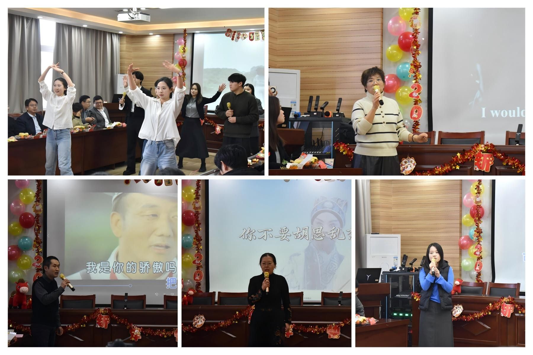 联欢会现场暖意融融、气氛热烈,陈娜娜、马上上两位老师携手薛竣航等同学演绎《当》《爱》两首经典歌曲,师生默契配合点燃全场;随后李媛钰老师献唱《最初的梦想》传递逐梦力量,刘凌老师京剧清唱《空城计》展现传统文化魅力,关浩杰老师的《父亲》以真挚情感诠释亲情温暖,张聿静老师的英文歌曲《Yesterday Once More》带大家重温岁月美好,每一个精彩节目都赢得全场热烈反响,掌声阵阵。